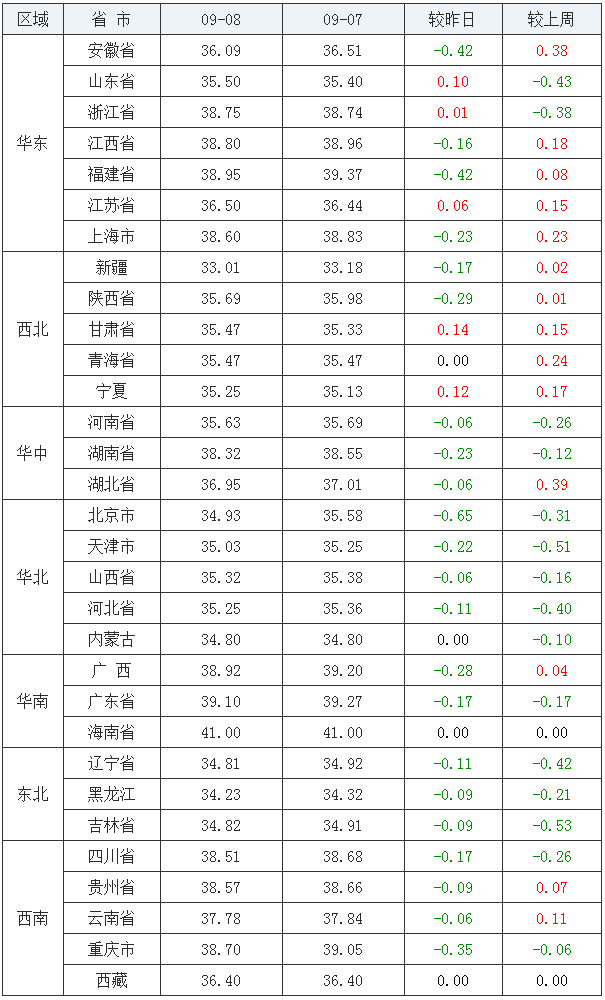 华东地区猪价最高省份为:福建省,外三元均价为38.95元/公斤,跌幅为0.42元/公斤;