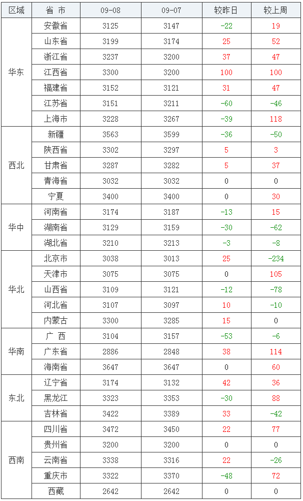 豆粕均价(饲料原料)后十:西藏自治区2642元/吨、广东省2886元/吨、青海省3032元/吨、北京市3038元/吨、天津市3075元/吨、广西壮族自治区3104元/吨、河北省3107元/吨、山西省3109元/吨、安徽省3125元/吨、湖南省3129元/吨。