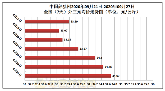 2020年09月27日(星期天),据中国养猪网猪价系统监测全国外三元均价为33.39元/公斤,猪价与昨日(33.07元/公斤)上涨了0.32元/公斤,较上月下跌了3.86元/公斤。