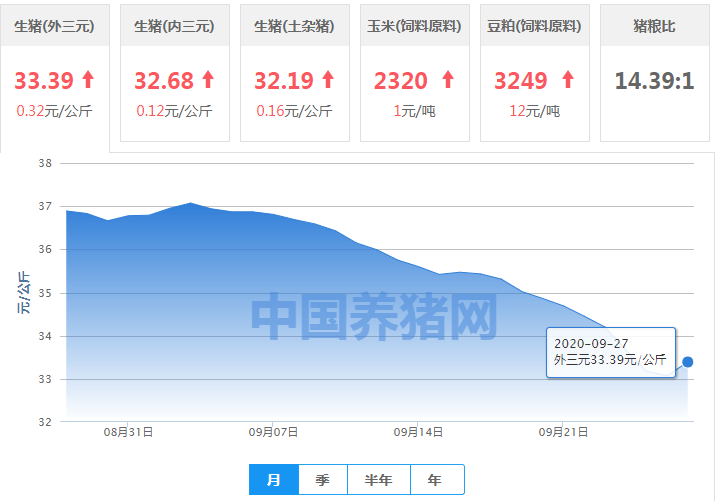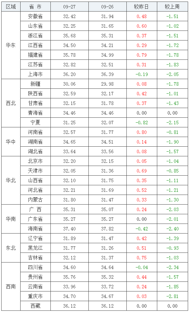从“全国外三元均价涨跌表”来看,今日国内大部分省份生猪均价似乎开始“起义”,前几日还处于低迷的猪价今日竟大部分“泛红”,31省份仅有4省下跌,行情得到充分的上涨加持。据我们分析,其原因是由于大部地区下跌过快,主产区均价跌至近期新低,养殖端抗价惜售心态增加,叠加双节备货时刻,屠宰量有一定提升,预计近期猪价或将出现短时反弹行情。但从长期来看,反弹行情持续时间将不会太长,因十月份消费提升的同时,生猪及猪肉供给也会增长,整体下跌调整行情将依旧是主旋律。