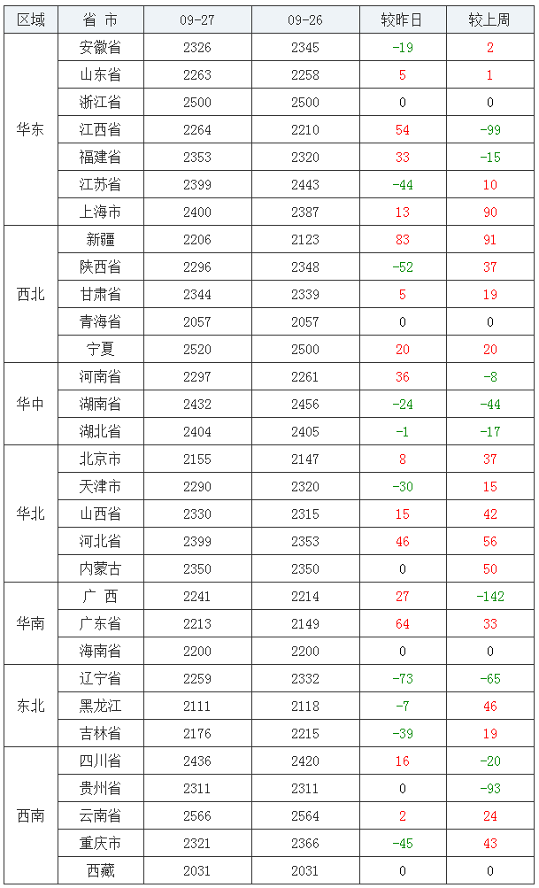2020年09月27日,今日全国玉米均价为2320元/吨,报价较昨日上涨了1元/吨。