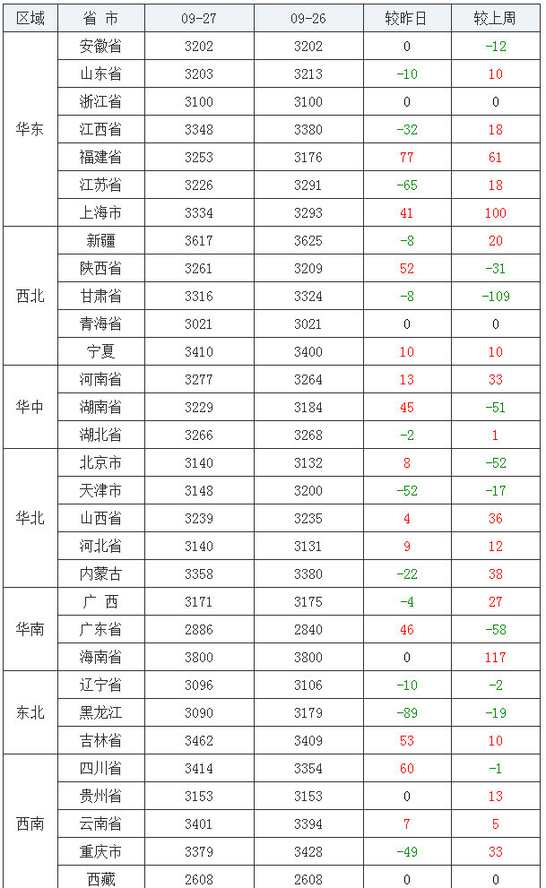 豆粕均价(饲料原料)前十:海南省3800元/吨、新疆维吾尔自治区3617元/吨、吉林省3462元/吨、四川省3414元/吨、宁夏回族自治区3410元/吨、云南省3401元/吨、重庆市3379元/吨、内蒙古自治区3358元/吨、江西省3348元/吨、上海市3334元/吨;