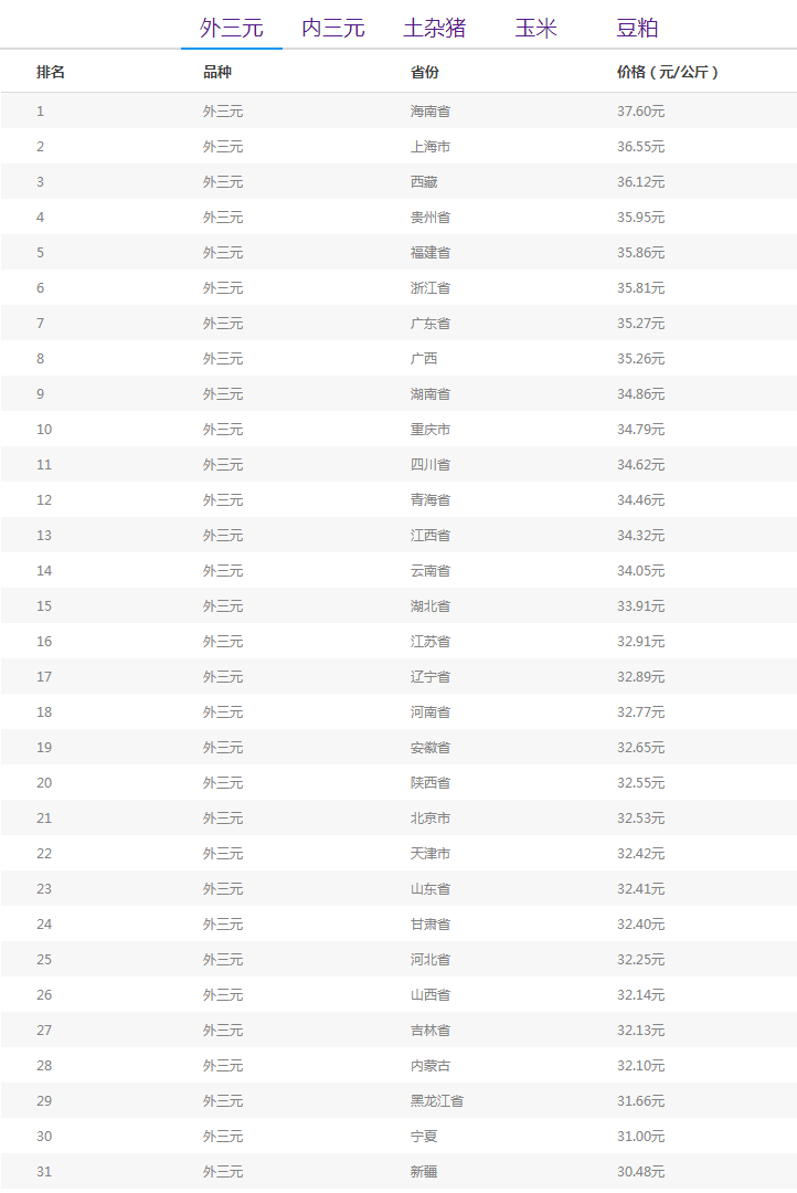 活猪价格排名前五的地区:海南省、上海市、西藏自治区、贵州省、福建省。
