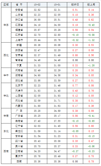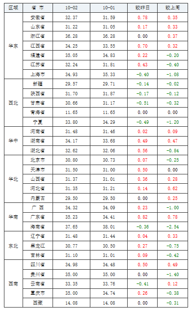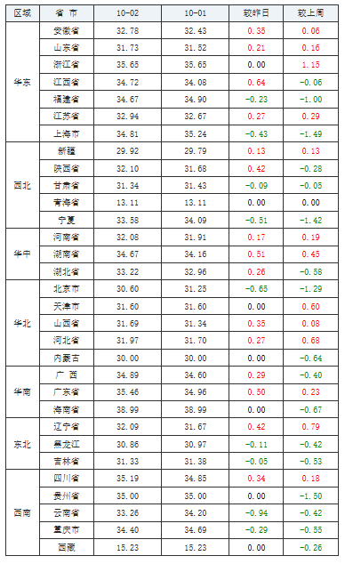 2020年10月02日全国内三元均价涨跌表