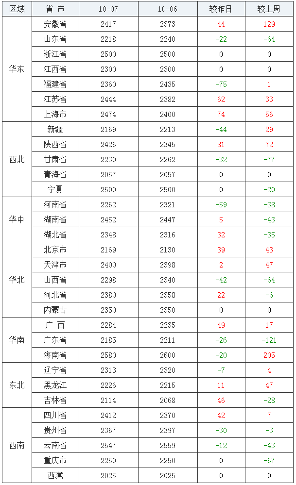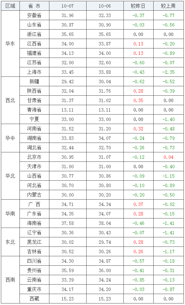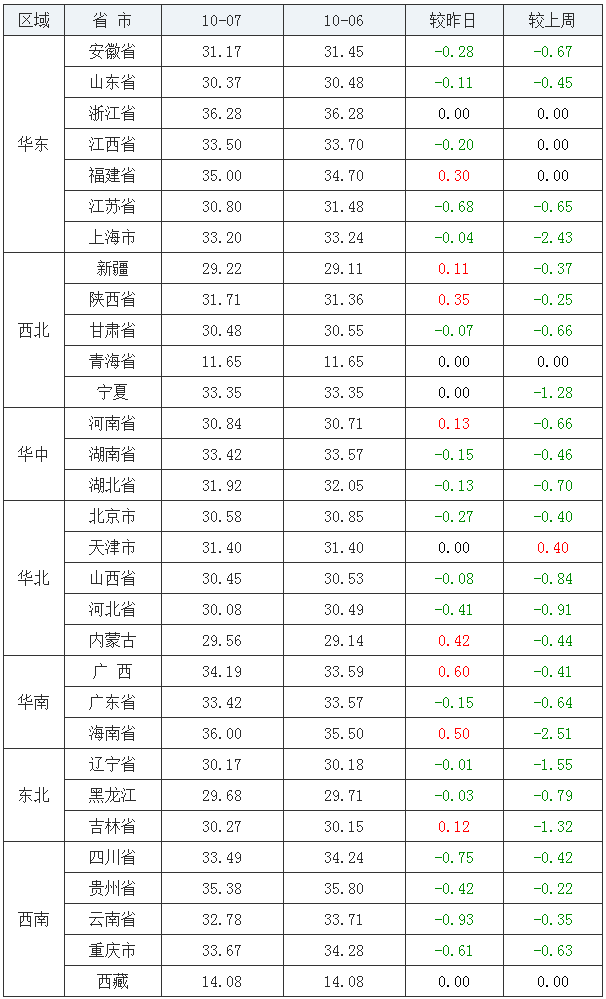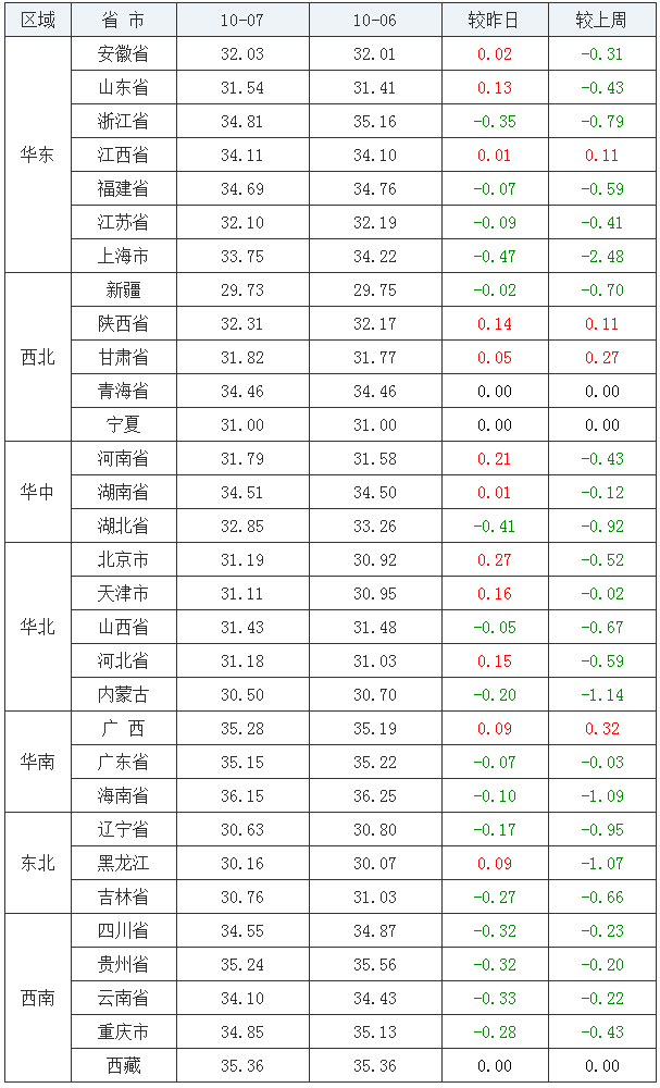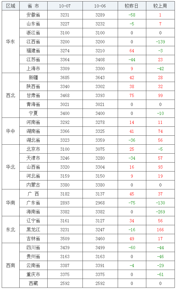2020年10月07日全国内三元均价涨跌表