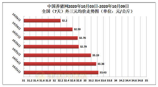 2020年10月09日(星期五),据中国养猪网猪价系统监测全国外三元均价为32.20元/公斤,猪价与昨日(32.59元/公斤)下跌了0.39元/公斤,较上月下跌了3.45元/公斤。