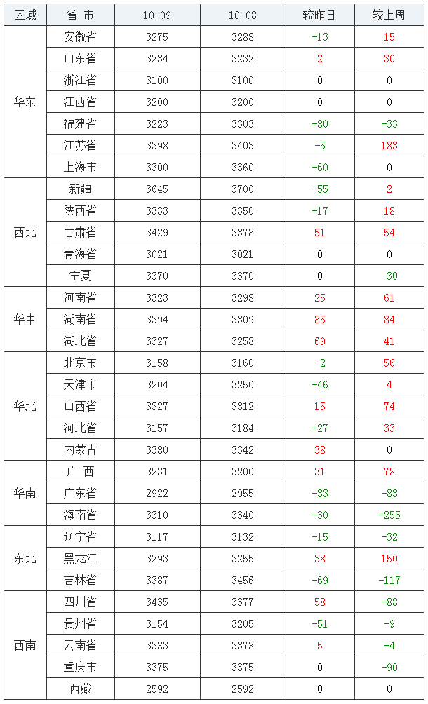 豆粕均价(饲料原料)前十:新疆维吾尔自治区3645元/吨、四川省3435元/吨、甘肃省3429元/吨、江苏省3398元/吨、湖南省3394元/吨、吉林省3387元/吨、云南省3383元/吨、内蒙古自治区3380元/吨、重庆市3375元/吨、宁夏回族自治区3370元/吨;