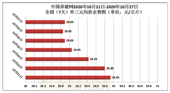 2020年10月27日(星期二),据中国养猪网猪价系统监测全国外三元均价为28.89元/公斤,猪价与昨日(28.85元/公斤)上涨了0.04元/公斤,较上月下跌了4.50元/公斤。