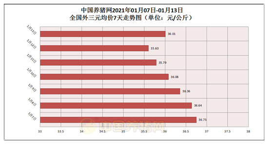 2021年01月13日(星期三),据中国养猪网猪价系统监测,全国外三元均价为36.01元/公斤,猪价较昨日(35.60元/公斤)上涨了0.41元/公斤,较上月(33.40元/公斤)上涨了2.61元/公斤。