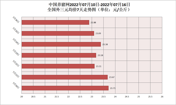2022年07月16日(星期六),据中国养猪网猪价系统监测,全国外三元均价为22.88元/公斤,猪价较昨日(23.09元/公斤)下跌了0.21元/公斤,较上月(16.62元/公斤)上涨了6.26元/公斤。