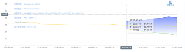 玄田算法是由项目课题组团队原创的非经典逻辑数值聚合理论和不确定性预测方法,构建了基于一致模算子的生猪价格预测模型。该模型采用的聚合函数及一致模相关理论与方法已获得多项国家自然科学基金和省级自然科学资金资助,并获得多项省级自然科学奖奖项。04月28日预测猪价为14.9523,置信区间在14.4459--15.4693之间。04月29日预测猪价为14.9284;04月30日预测猪价为14.8402。