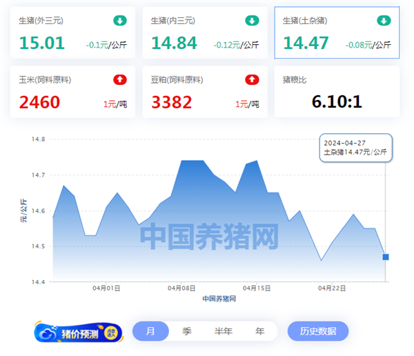 全国(生猪品种:土杂猪)均价为14.47元/公斤,猪价较昨日下跌了0.08元/公斤,环比下跌0.75%,同比上涨2.84%;
