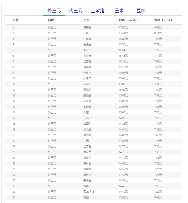 外三元排行后三:新疆维吾尔自治区13.90元/公斤、黑龙江省14.40元/公斤、四川省14.49元/公斤;