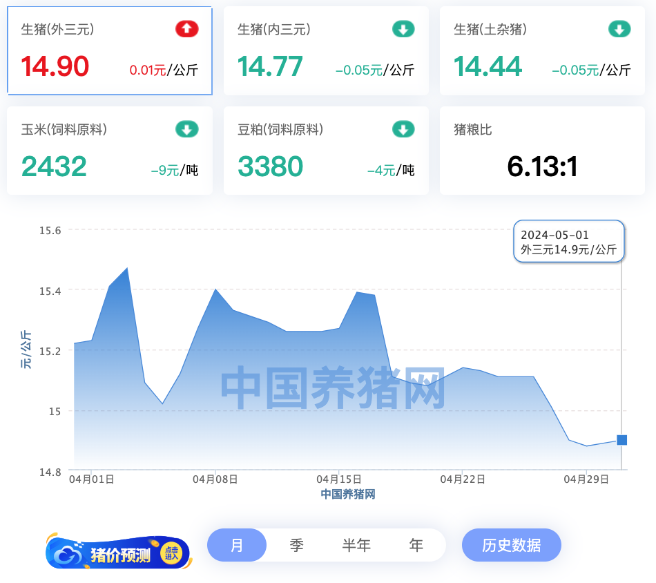 全国(生猪品种:外三元)均价为14.90元/公斤,猪价较昨日上涨了0.01元/公斤,环比下跌2.17%,同比上涨1.85%;
