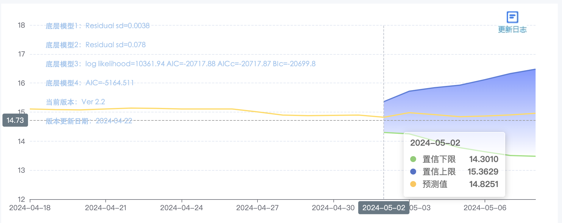 玄田算法是由项目课题组团队原创的非经典逻辑数值聚合理论和不确定性预测方法,构建了基于一致模算子的生猪价格预测模型。该模型采用的聚合函数及一致模相关理论与方法已获得多项国家自然科学基金和省级自然科学资金资助,并获得多项省级自然科学奖奖项。05月02日预测猪价为14.8251,置信区间在14.3010--15.3629之间。05月03日预测猪价为14.9819;05月04日预测猪价为14.9161。