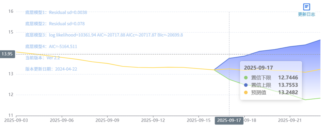 玄田算法是由项目课题组团队原创的非经典逻辑数值聚合理论和不确定性预测方法,构建了基于一致模算子的生猪价格预测模型。该模型采用的聚合函数及一致模相关理论与方法已获得多项国家自然科学基金和省级自然科学资金资助,并获得多项省级自然科学奖奖项。09月17日预测猪价为13.2482,置信区间在12.7446--13.7553之间。09月18日预测猪价为13.1751;09月19日预测猪价为13.2441。