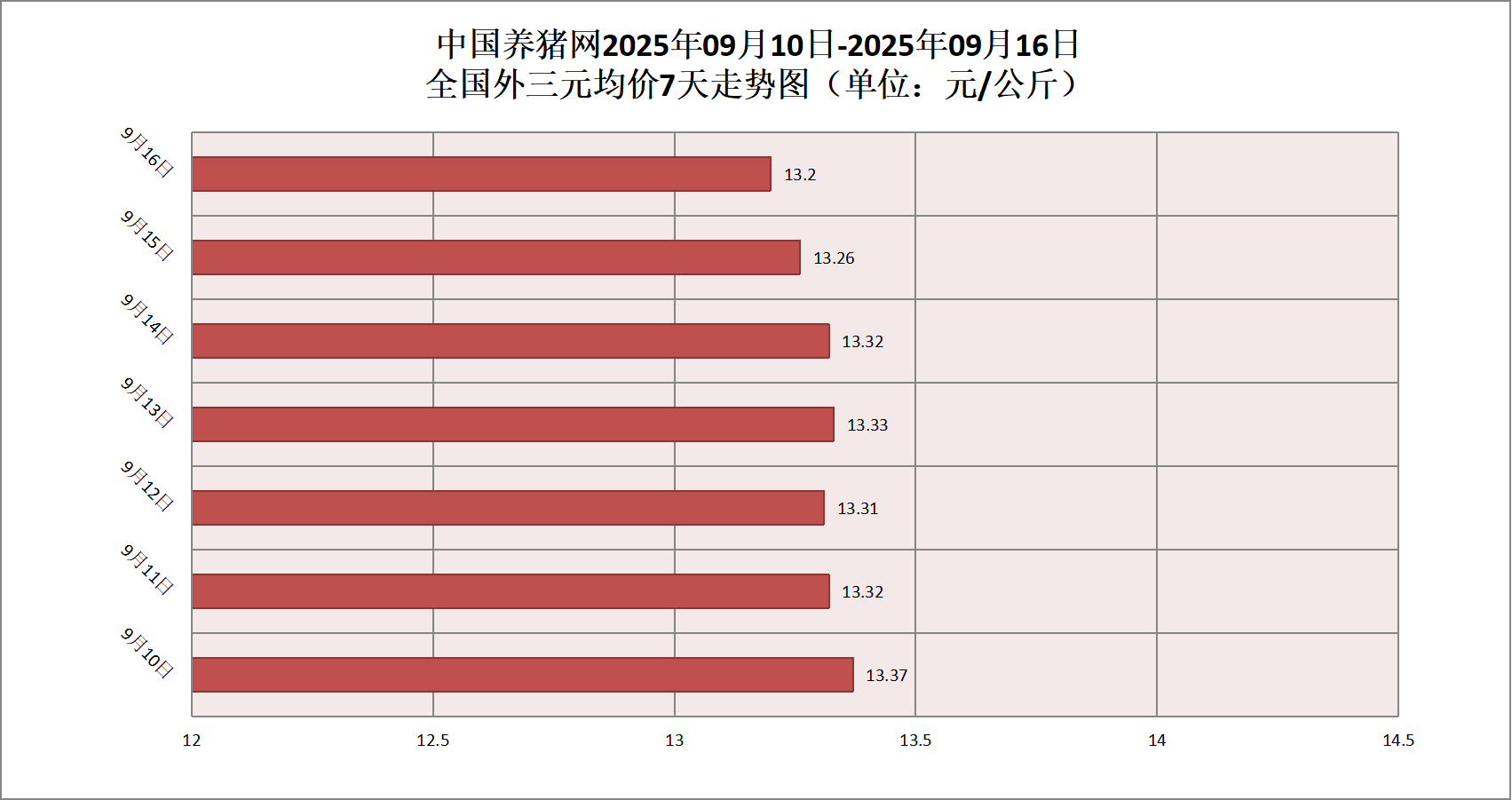 2025年09月16日(星期二),据中国养猪网猪价系统监测,全国外三元均价为13.20元/公斤,猪价较昨日(13.26元/公斤)下跌了0.06元/公斤,较上月(13.80元/公斤)下跌了0.60元/公斤。