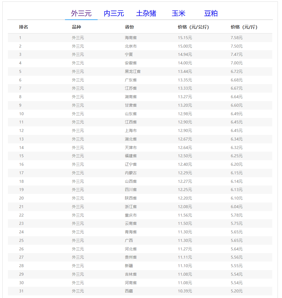 外三元排行前三:海南省15.15元/公斤、北京市15.00元/公斤、宁夏回族自治区12.94元/公斤;
