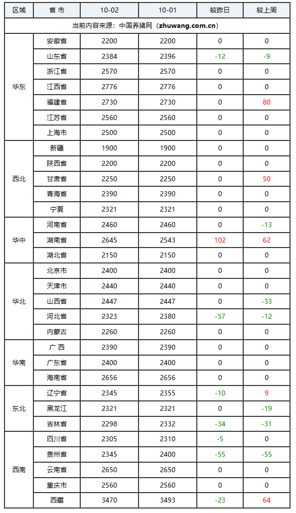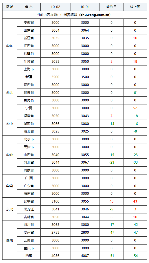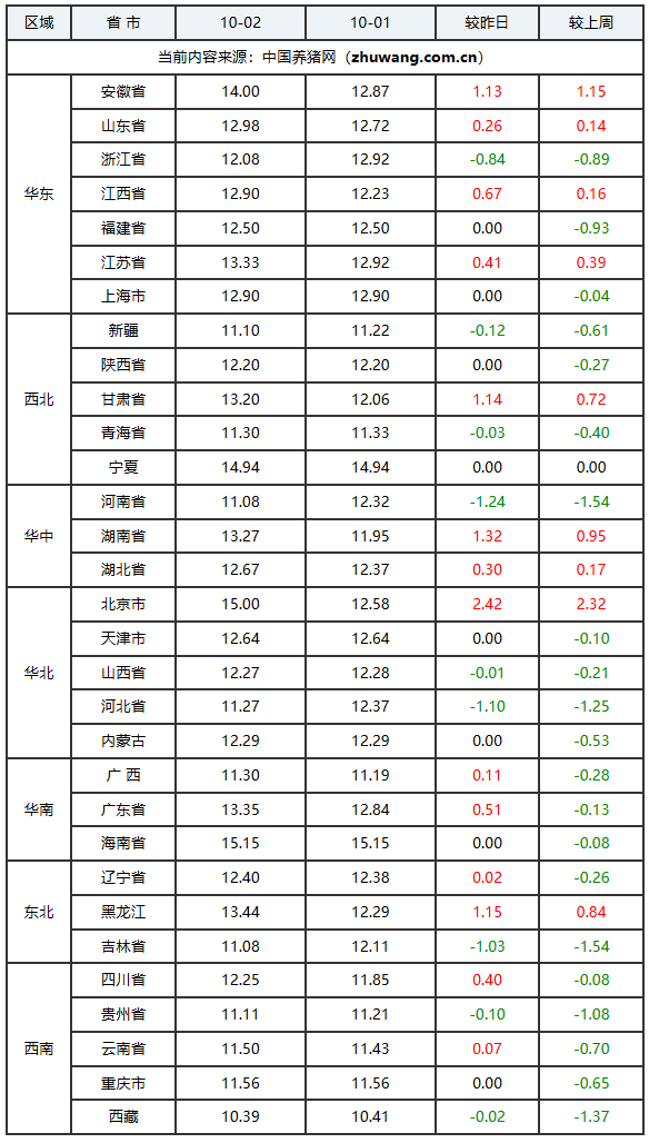 猪价上涨地区(15个):安徽省、北京市、辽宁省、湖南省、广东省、黑龙江省、四川省、云南省、江西省、宁夏回族自治区、江苏省、山东省、陕西省、甘肃省、湖北省、广西壮族自治区;上涨区间:0.02-1.32元/公斤;