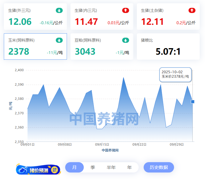 全国(生猪品种:土杂猪)均价为12.11元/公斤,猪价较昨日上涨0.20元/公斤,环比下跌9.29%,同比下跌30.32%;