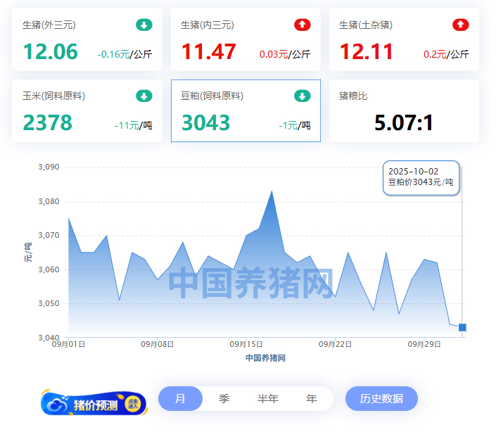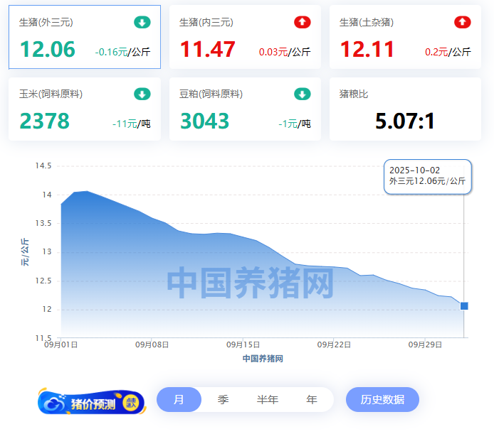 全国(生猪品种:外三元)均价为12.06元/公斤,猪价较昨日下跌0.16元/公斤,环比下跌14.10%,同比下跌33.44%;