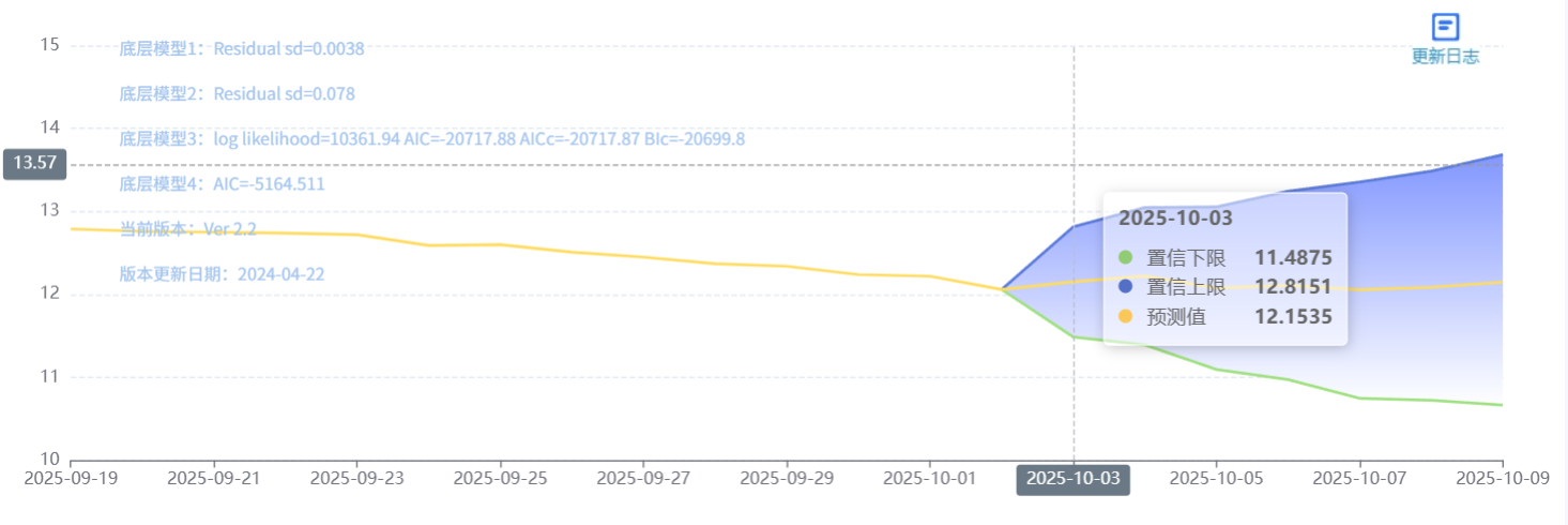 玄田算法是由项目课题组团队原创的非经典逻辑数值聚合理论和不确定性预测方法,构建了基于一致模算子的生猪价格预测模型。该模型采用的聚合函数及一致模相关理论与方法已获得多项国家自然科学基金和省级自然科学资金资助,并获得多项省级自然科学奖奖项。10月03日预测猪价为12.1535,置信区间在11.4875--12.8151之间。10月04日预测猪价为12.2216;10月05日预测猪价为12.0770。