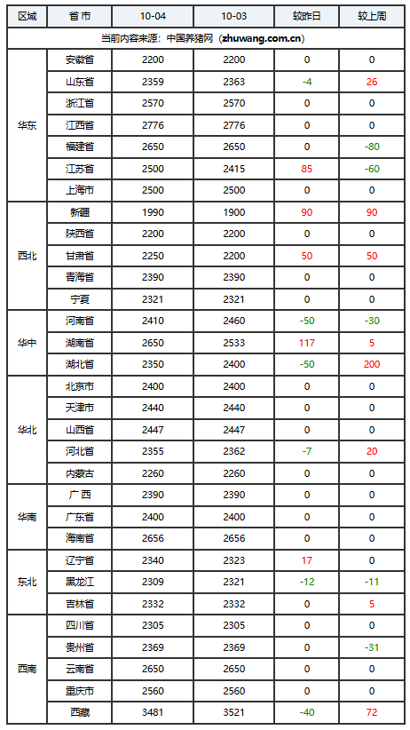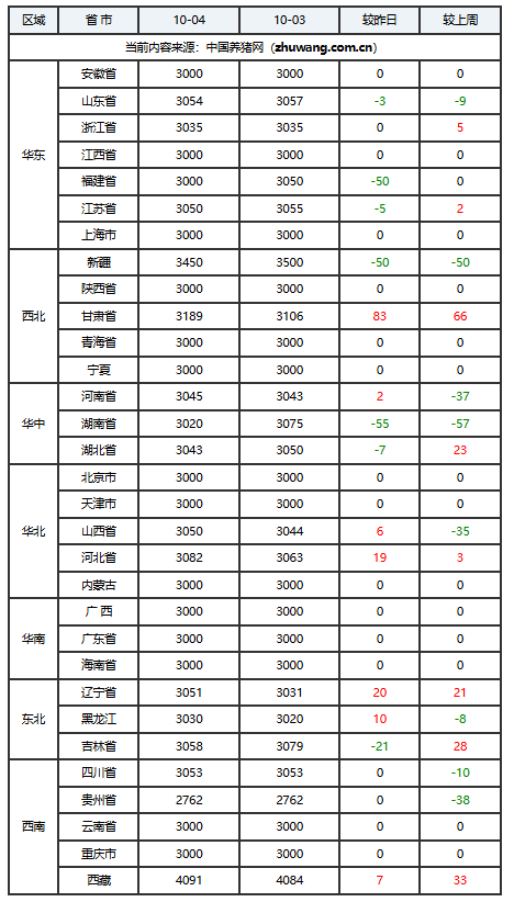 猪价上涨地区(11个):浙江省、新疆维吾尔自治区、陕西省、甘肃省、河南省、山西省、河北省、海南省、贵州省、西藏自治区、吉林省;上涨区间:0.02-1.64元/公斤;