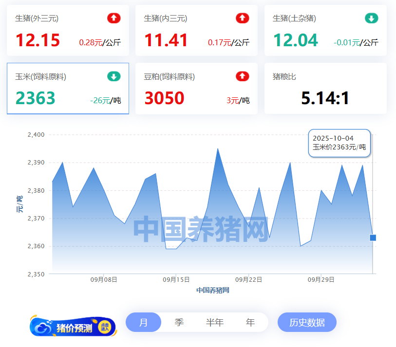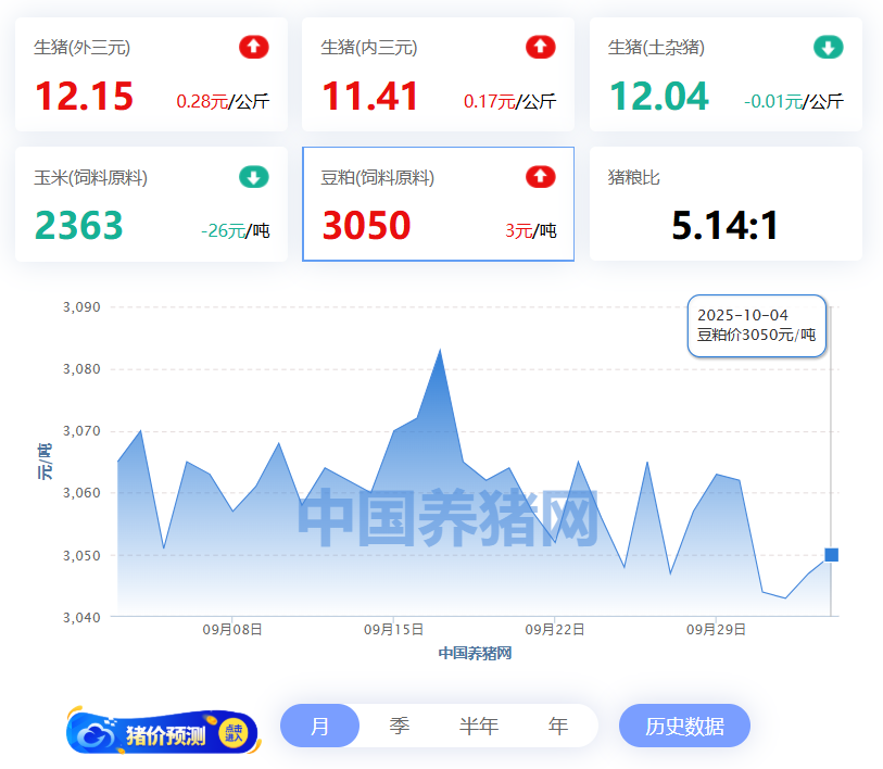 2025年10月04日,全国生猪价格呈现大部上涨态势,外三元平均价格涨至12.15元/公斤,较昨日上涨0.28元/公斤。随着国庆及中秋假期步入正轨,旅游与餐饮消费热度有所提升,终端猪肉消费受到家庭需求的拉动出现回暖迹象,市场购销氛围随之改善。具体来看,一方面进入月末和月初阶段,南北地区的规模养殖企业普遍存在缩量出栏的倾向,部分集团猪企在假期阶段减少出栏计划,导致生猪供应压力阶段性缓解,市场看涨情绪有所抬头。另一方面,节日效应带动餐饮及旅游消费回升,下游猪肉走货速度加快,白条销售压力减轻,屠宰企业采购难度有所上升,部分企业为保障货源已出现小幅提价行为。因此,在供应收紧与消费回暖的双重支撑下,今日生猪价格呈现震荡偏强走势。