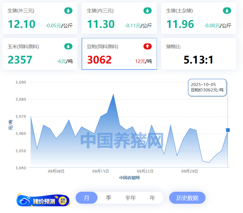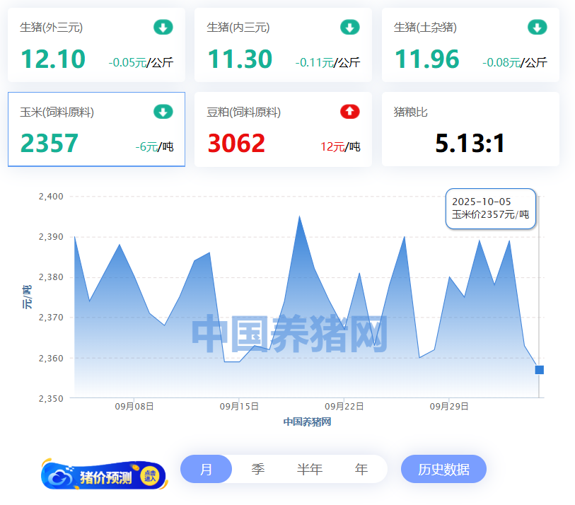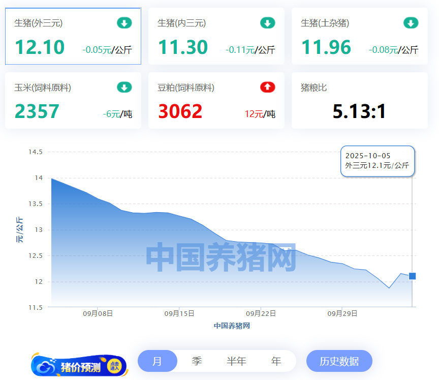 2025年10月05日,外三元平均价格跌至12.10元/公斤,较昨日下跌0.05元/公斤。市场未延续此前预期的回暖走势,反而呈现“一夜回调”的态势,整体走势弱于市场预期。从供应端来看,养殖企业出栏积极性较高,叠加南北各地适重生猪供应整体充裕,市场猪源充足。在需求端来看,尽管节日效应带动消费有所回暖,旅游出行活跃度提升,餐饮及堂食消费增加,加上婚宴等集中举办对猪肉内需形成一定支撑,但整体提振力度有限。在多空因素交织之下,近期猪价总体以稳中偏弱为主,继续保持低位震荡格局。