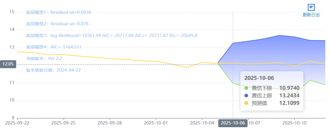 玄田算法是由项目课题组团队原创的非经典逻辑数值聚合理论和不确定性预测方法,构建了基于一致模算子的生猪价格预测模型。该模型采用的聚合函数及一致模相关理论与方法已获得多项国家自然科学基金和省级自然科学资金资助,并获得多项省级自然科学奖奖项。10月06日预测猪价为12.1099,置信区间在10.9740--13.2434之间。10月07日预测猪价为12.0564;10月08日预测猪价为12.0867。