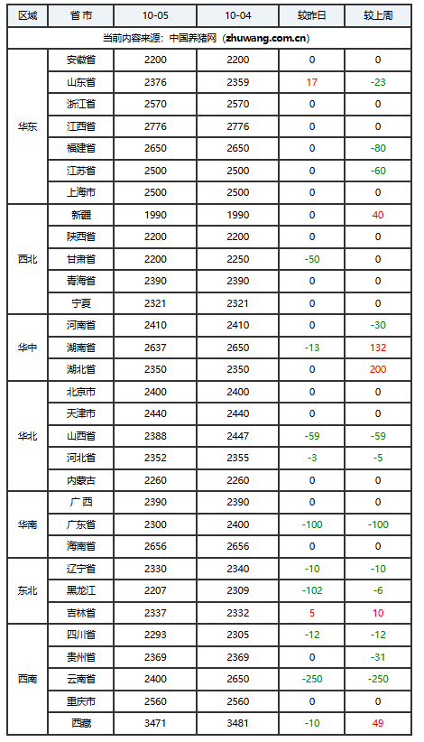 猪价下跌地区(20个):福建省、湖北省、内蒙古自治区、安徽省、上海市、重庆市、青海省、北京市、湖南省、黑龙江省、浙江省、西藏自治区、新疆维吾尔自治区、陕西省、甘肃省、河南省、山西省、河北省、海南省、四川省;下跌区间:0.01-0.26元/公斤;