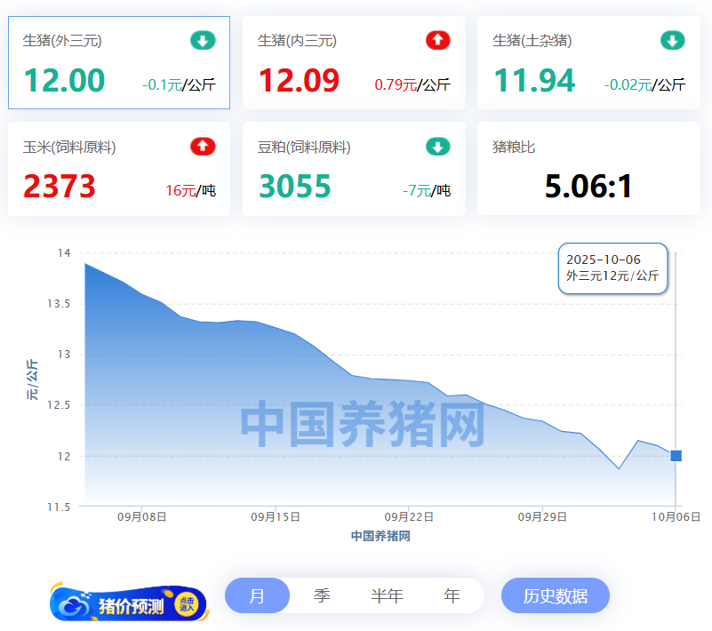 2025年10月06日(星期一),据中国养猪网猪价系统监测,全国外三元均价为12.00元/公斤,猪价较昨日(12.10元/公斤)下跌了0.10元/公斤,较上月(13.80元/公斤)下跌了1.80元/公斤。