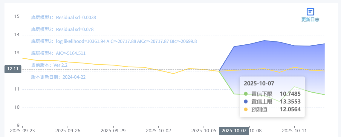 玄田算法是由项目课题组团队原创的非经典逻辑数值聚合理论和不确定性预测方法,构建了基于一致模算子的生猪价格预测模型。该模型采用的聚合函数及一致模相关理论与方法已获得多项国家自然科学基金和省级自然科学资金资助,并获得多项省级自然科学奖奖项。10月07日预测猪价为12.0564,置信区间在10.7485--13.3553之间。10月08日预测猪价为12.0867;10月09日预测猪价为12.1483。