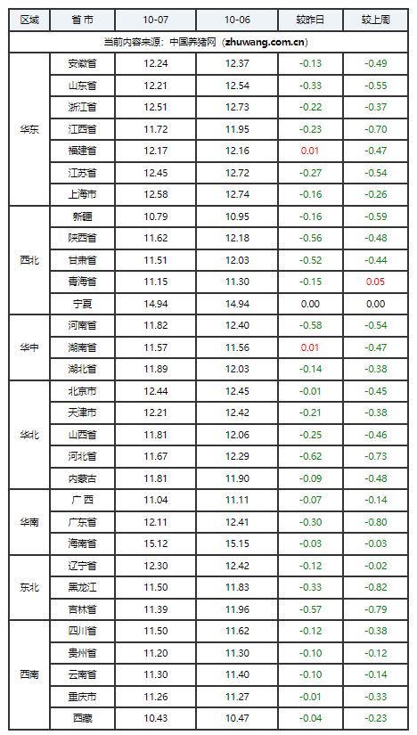 猪价下跌地区(28个):广西壮族自治区、浙江省、上海市、青海省、河南省、河北省、辽宁省、吉林省、云南省、江苏省、天津市、江西省、山东省、广东省、贵州省、湖北省、内蒙古自治区、安徽省、重庆市、北京市、黑龙江省、西藏自治区、新疆维吾尔自治区、陕西省、甘肃省、山西省、海南省、四川省;下跌区间:0.01-0.62元/公斤;