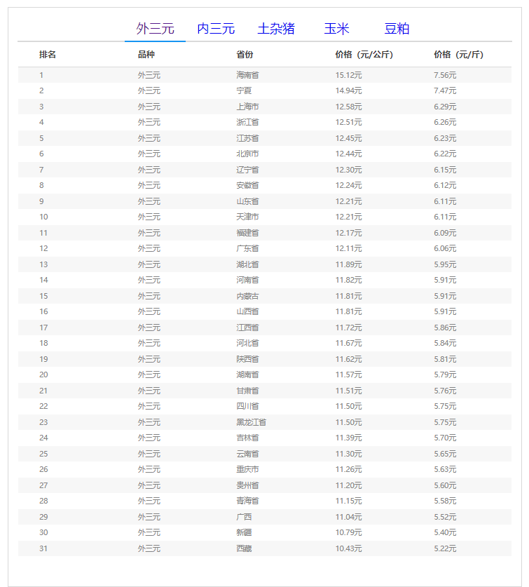 外三元排行后三:西藏自治区10.43元/公斤、新疆维吾尔自治区10.79元/公斤、广西壮族自治区11.04元/公斤;
