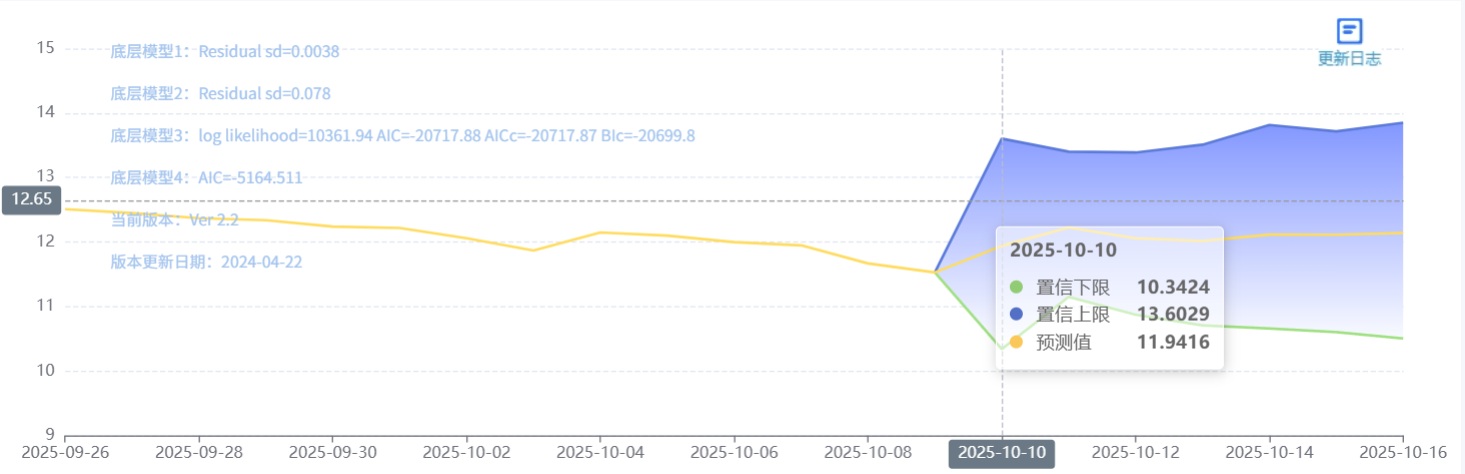 玄田算法是由项目课题组团队原创的非经典逻辑数值聚合理论和不确定性预测方法,构建了基于一致模算子的生猪价格预测模型。该模型采用的聚合函数及一致模相关理论与方法已获得多项国家自然科学基金和省级自然科学资金资助,并获得多项省级自然科学奖奖项。10月10日预测猪价为11.9416,置信区间在10.3424--13.6029之间。10月11日预测猪价为12.2260;10月12日预测猪价为12.0604。