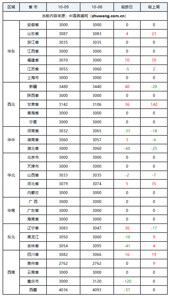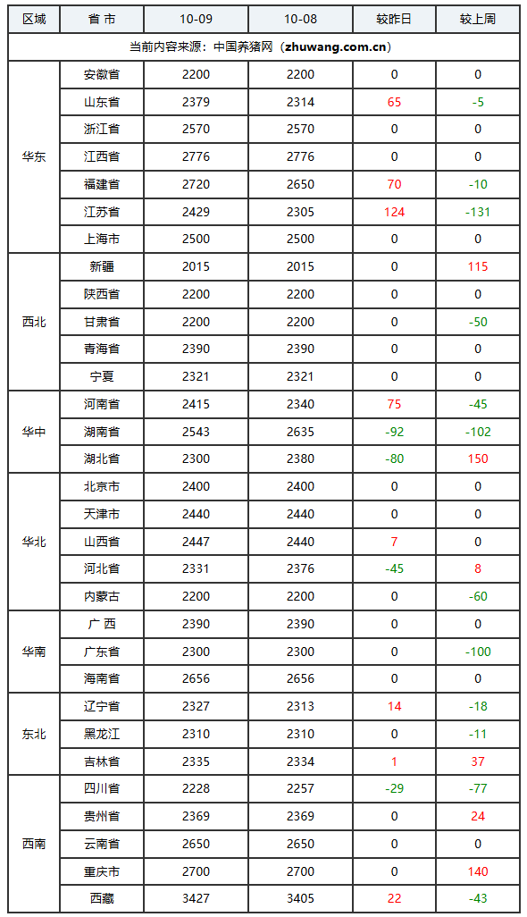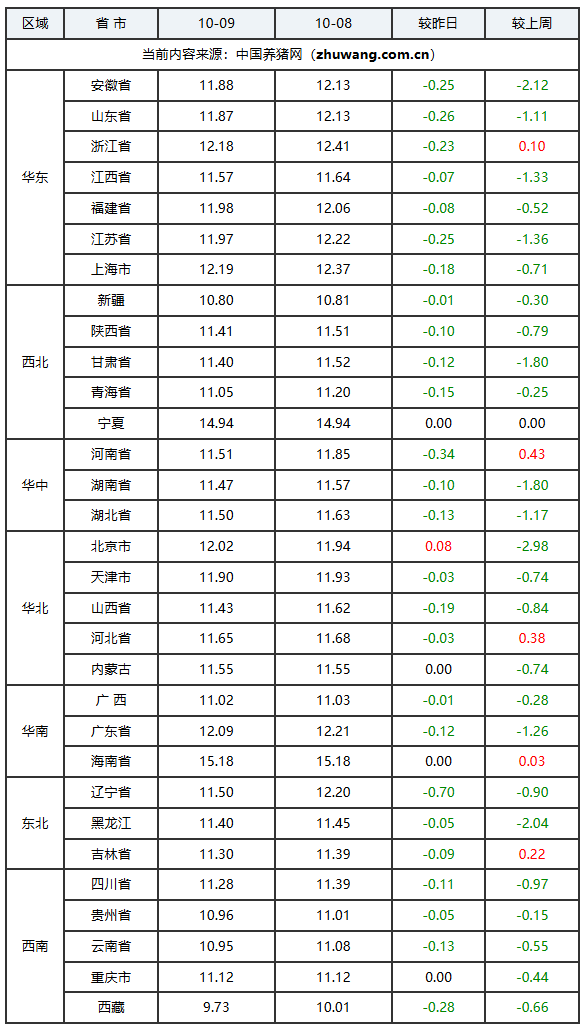 猪价下跌地区(26个):福建省、广西壮族自治区、浙江省、上海市、辽宁省、云南省、江苏省、天津市、江西省、山东省、贵州省、湖北省、新疆维吾尔自治区、甘肃省、青海省、河南省、河北省、广东省、湖南省、吉林省、安徽省、黑龙江省、西藏自治区、陕西省、山西省、四川省;下跌区间:0.01-0.70元/公斤;