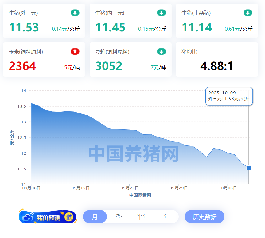 全国(生猪品种:外三元)均价为11.53元/公斤,猪价较昨日下跌0.14元/公斤,环比下跌14.66%,同比下跌34.56%;