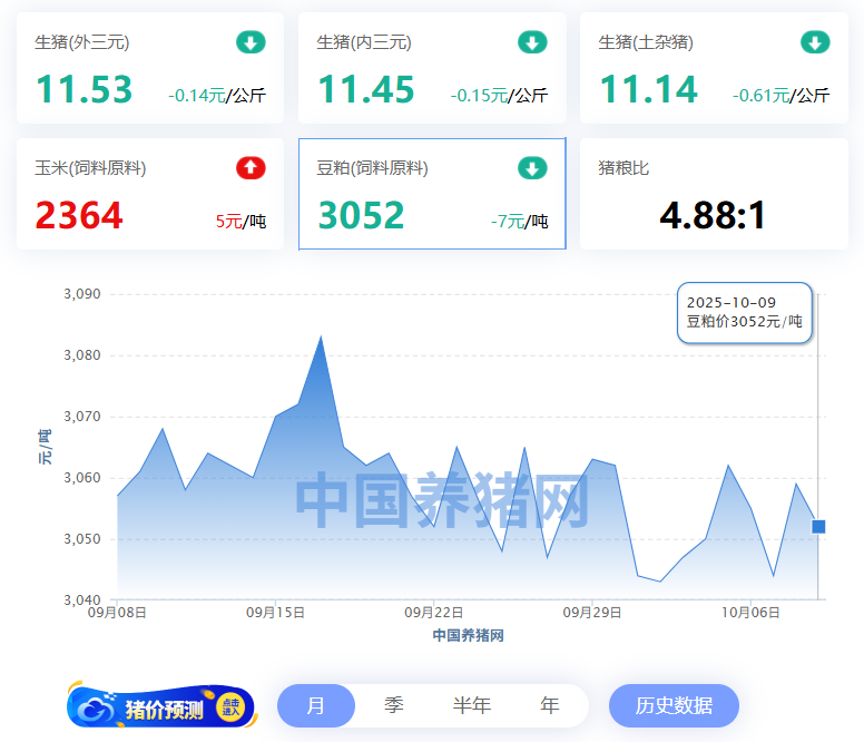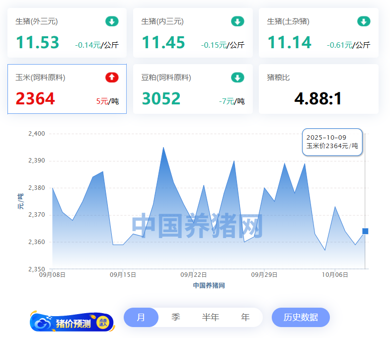双节期间国内生猪市场并未迎来预期中的价格支撑,行情反而持续探底,全国标猪均价进一步下探,普遍跌入“5元区间”,创下春节以来的价格新低,且市场看空情绪依旧浓厚,预计短期内猪价仍将处于低位震荡阶段。从生产层面看,养殖端出栏心态出现分化:规模养殖企业特别是部分头部企业,受上月出栏进度滞后的影响,本月供应压力显著,整体出栏意愿较强;而散养户因面临较高的育肥成本,亏损面持续扩大,尤其在东北等地区,养殖户惜售观望情绪升温,局部存在扛价心态。与此同时,需求端表现同样疲软,双节过后旅游餐饮消费降温,家庭采购跟进乏力,终端消费呈惯性回落态势。屠宰企业普遍反映订单量偏低,开工率维持低位,整体需求对猪价难以形成有效拉动。综合来看,在供强需弱的产销错配局面持续作用下,生猪价格短期内仍将面临下行压力。