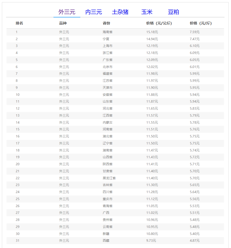 外三元排行后三:西藏自治区10.01元/公斤、新疆维吾尔自治区10.81元/公斤、云南省10.95元/公斤;