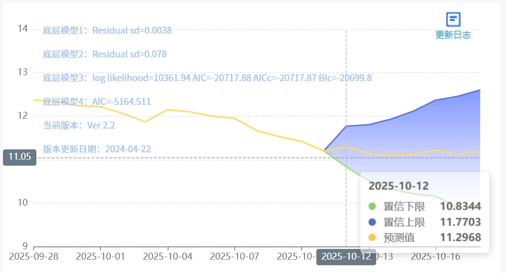 玄田算法是由项目课题组团队原创的非经典逻辑数值聚合理论和不确定性预测方法,构建了基于一致模算子的生猪价格预测模型。该模型采用的聚合函数及一致模相关理论与方法已获得多项国家自然科学基金和省级自然科学资金资助,并获得多项省级自然科学奖奖项。10月12日预测猪价为11.2968,置信区间在10.8344--11.7703之间。10月13日预测猪价为11.1474;10月14日预测猪价为11.1043。