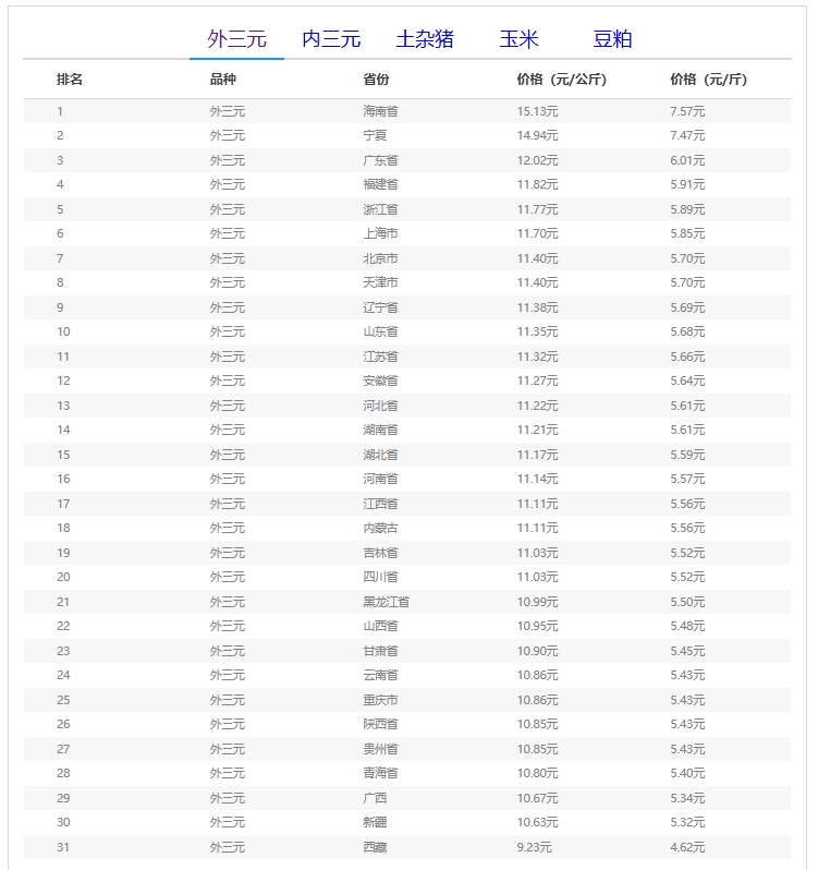 全国外三元生猪价格排行榜