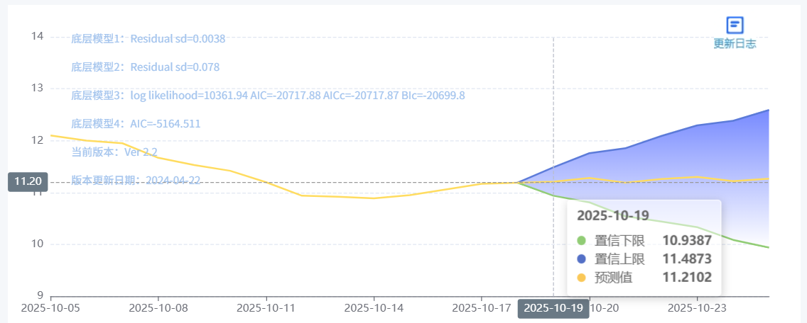 玄田算法是由项目课题组团队原创的非经典逻辑数值聚合理论和不确定性预测方法,构建了基于一致模算子的生猪价格预测模型。该模型采用的聚合函数及一致模相关理论与方法已获得多项国家自然科学基金和省级自然科学资金资助,并获得多项省级自然科学奖奖项。10月19日预测猪价为11.2102,置信区间在10.9387--11.4873之间。10月20日预测猪价为11.2812;10月21日预测猪价为11.1913。