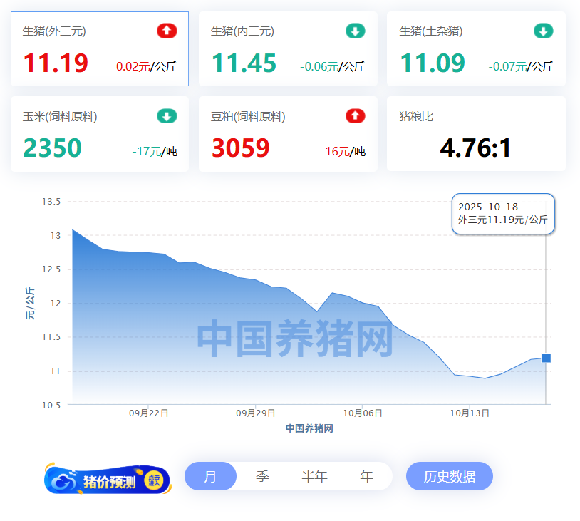 全国(生猪品种:外三元)均价为11.19元/公斤,猪价较昨日上涨0.02元/公斤,环比下跌13.46%,同比下跌36.74%;