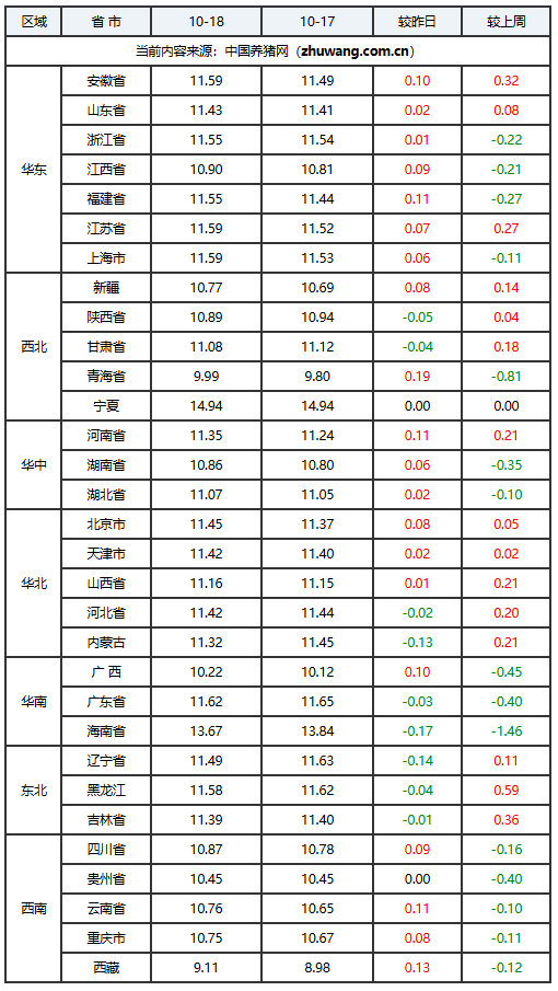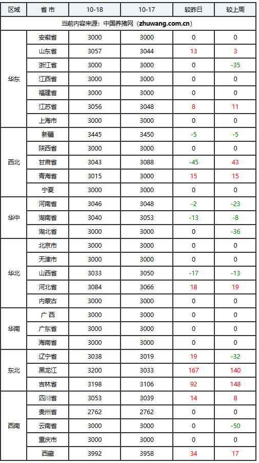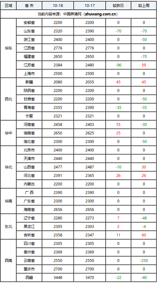 猪价上涨地区(20个):安徽省、山东省、浙江省、江苏省、上海市、河南省、云南省、江西省、湖南省、四川省、山西省、新疆维吾尔自治区、天津市、西藏自治区、福建省、广西壮族自治区、湖北省、重庆市、青海省、北京市;上涨区间:0.01-0.19元/公斤;