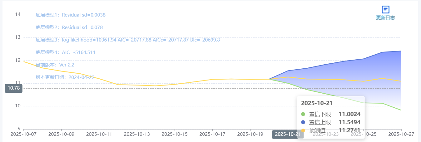 玄田算法是由项目课题组团队原创的非经典逻辑数值聚合理论和不确定性预测方法,构建了基于一致模算子的生猪价格预测模型。该模型采用的聚合函数及一致模相关理论与方法已获得多项国家自然科学基金和省级自然科学资金资助,并获得多项省级自然科学奖奖项。10月21日预测猪价为11.2741,置信区间在11.0024--11.5494之间。10月22日预测猪价为11.1875;10月23日预测猪价为11.1770。