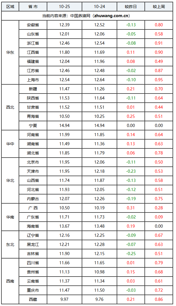 猪价上涨地区(14个):海南省、广西壮族自治区、江西省、福建省、四川省、贵州省、云南省、西藏自治区、湖南省、青海省、湖北省、河南省、新疆维吾尔自治区、甘肃省;上涨区间:0.01-0.31元/公斤;