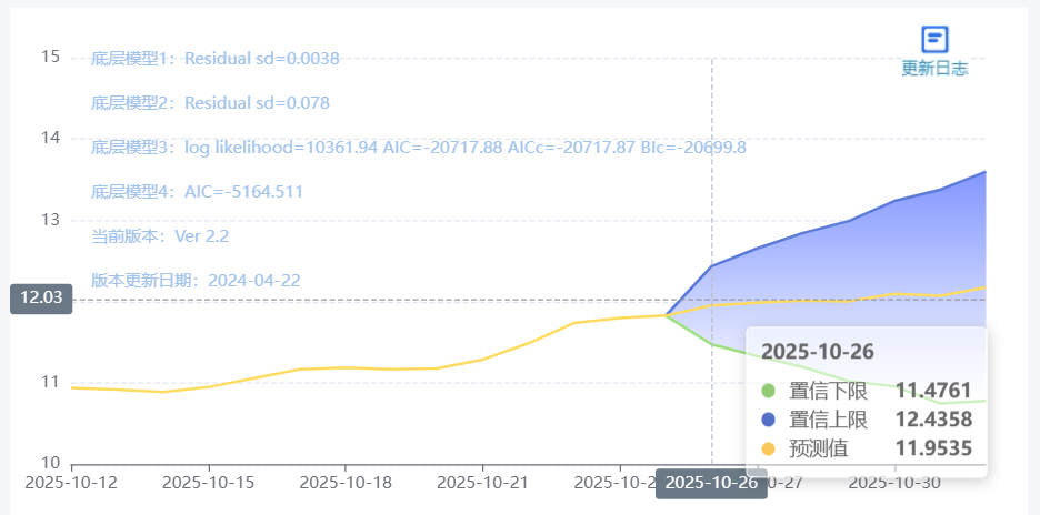 玄田算法是由项目课题组团队原创的非经典逻辑数值聚合理论和不确定性预测方法,构建了基于一致模算子的生猪价格预测模型。该模型采用的聚合函数及一致模相关理论与方法已获得多项国家自然科学基金和省级自然科学资金资助,并获得多项省级自然科学奖奖项。10月26日预测猪价为11.9535,置信区间在11.4761--12.4358之间。10月27日预测猪价为11.9893;10月28日预测猪价为12.0170。
