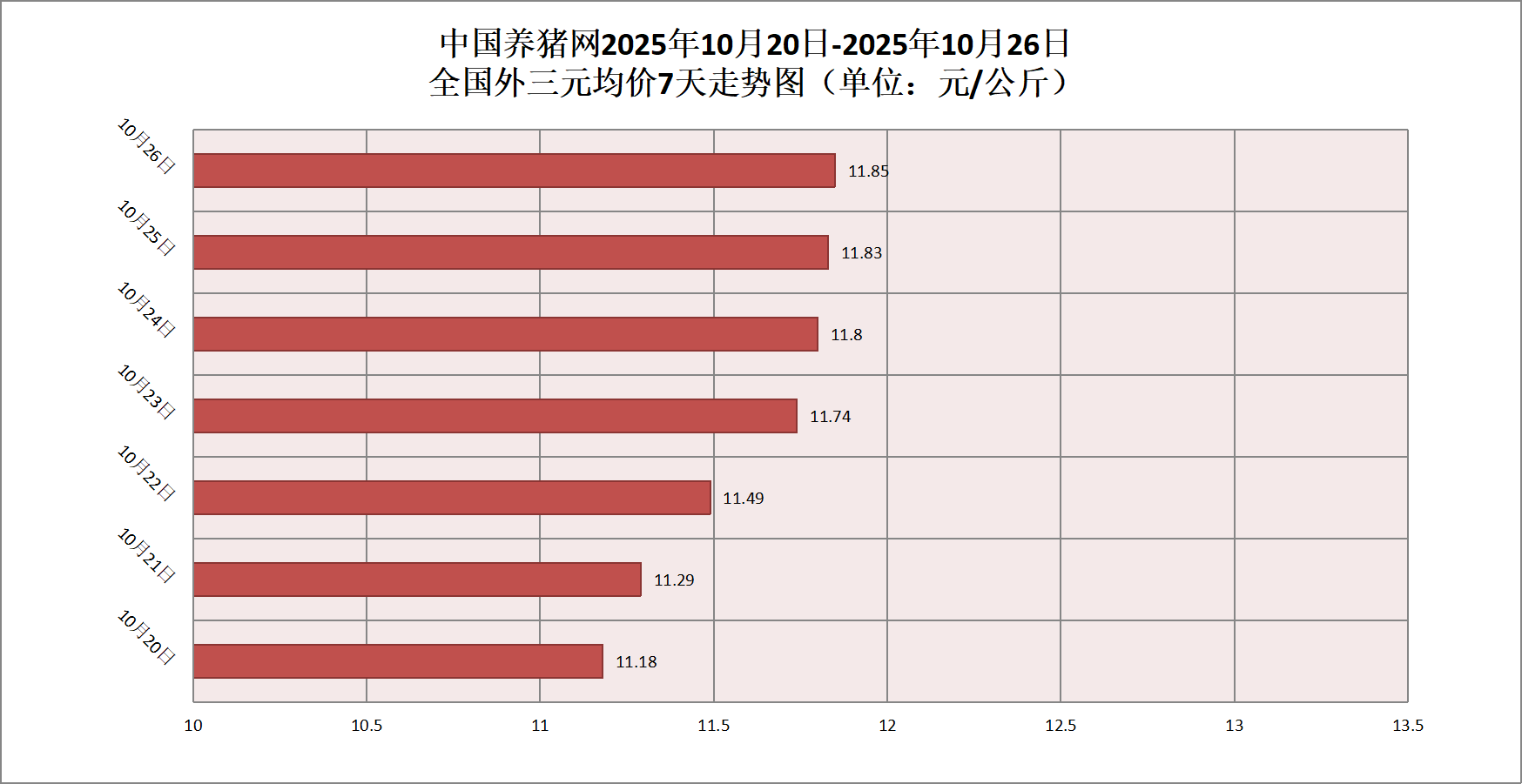 2025年10月26日(星期日),据中国养猪网猪价系统监测,全国外三元均价为11.85元/公斤,猪价较昨日(11.83元/公斤)上涨了0.02元/公斤,较上月(12.51元/公斤)下跌了0.66元/公斤。