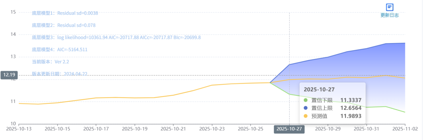 玄田算法是由项目课题组团队原创的非经典逻辑数值聚合理论和不确定性预测方法,构建了基于一致模算子的生猪价格预测模型。该模型采用的聚合函数及一致模相关理论与方法已获得多项国家自然科学基金和省级自然科学资金资助,并获得多项省级自然科学奖奖项。10月27日预测猪价为11.9893,置信区间在11.3337--12.6264之间。10月28日预测猪价为12.0170;10月29日预测猪价为12.0071。